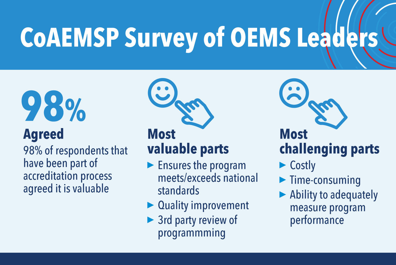 The CoAEMSP encourage the use of quality data sources—including data collected via the annual report, self-study report and site visit report in addition to research conducted by other organizations—to inform and strengthen the EMS profession. Learn more about our data use policy in the CoAEMSP Policies and Procedures Manual, Section XVIII. Data Use Policy.